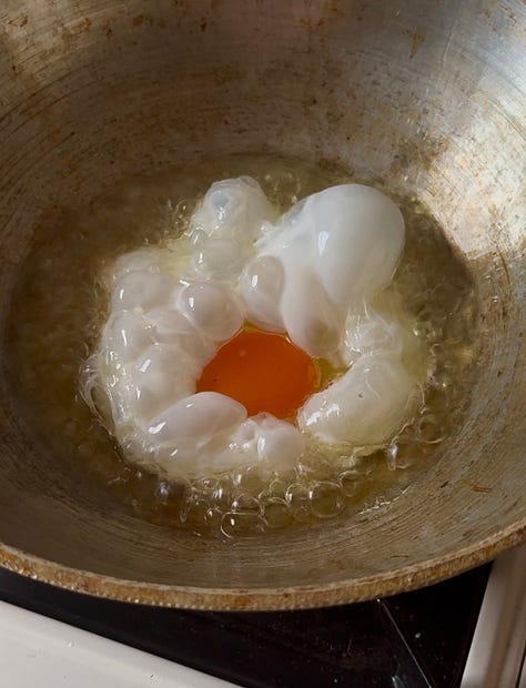 You can, of course, fry your egg in a small frying pan, but I prefer using a small wok so there’s enough depth of oil for it to puff and blister properly.