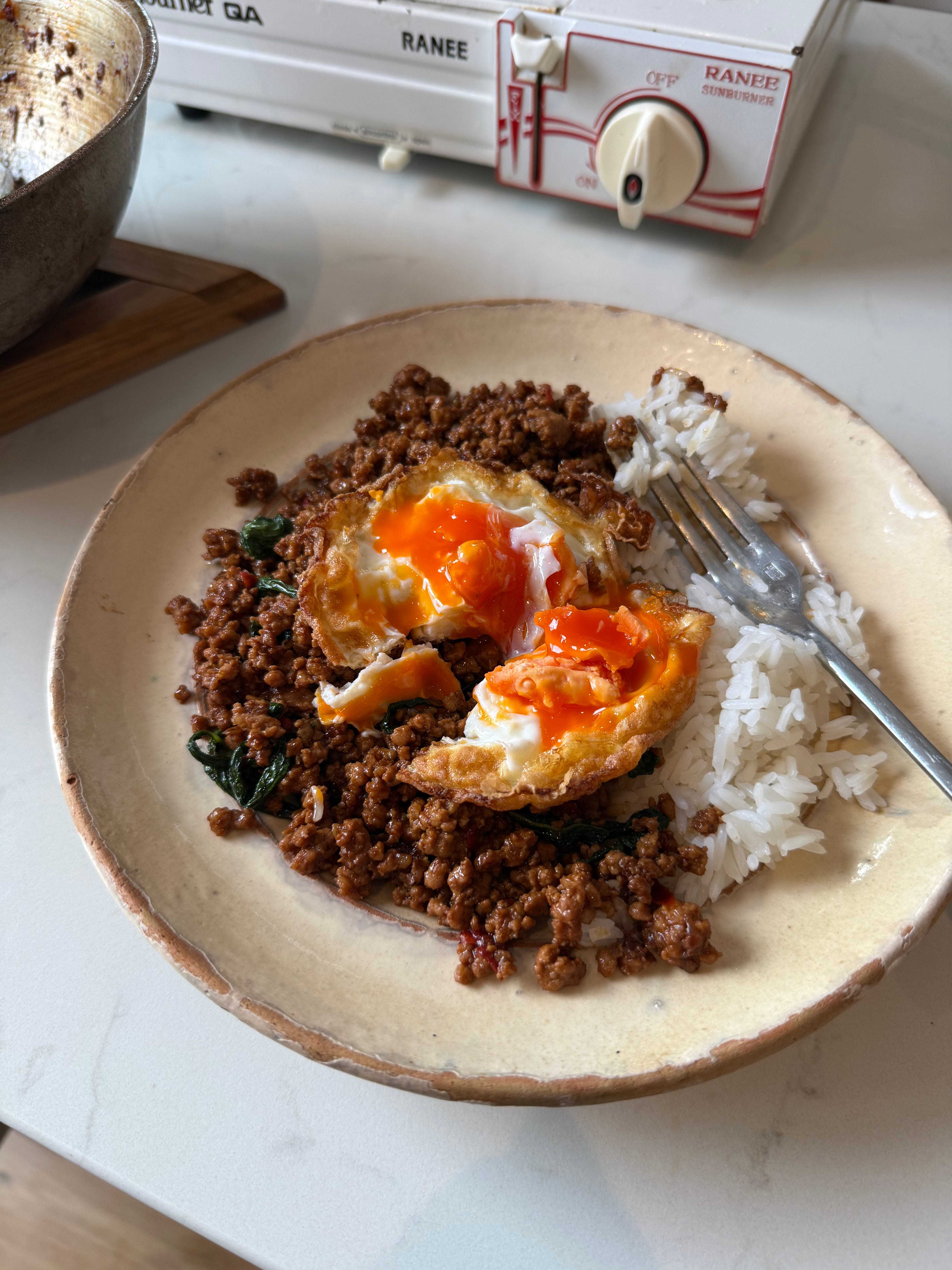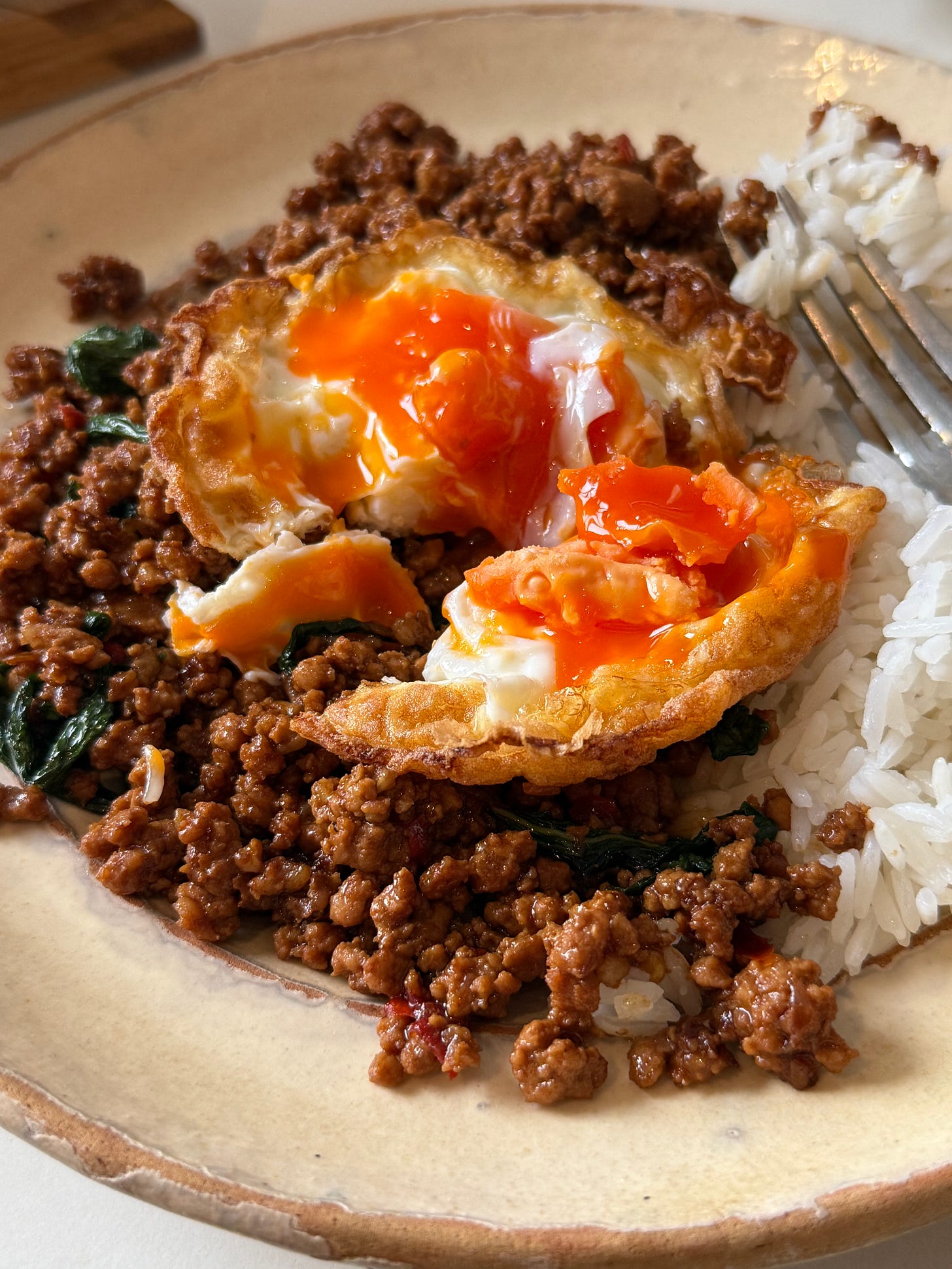 Add a sprinkle of white pepper (or black pepper if you’re using beef), turn off the heat and throw in the basil leaves and give everything a good toss. Check for seasoning and you’re ready to serve alongside some rice and the fried eggs.