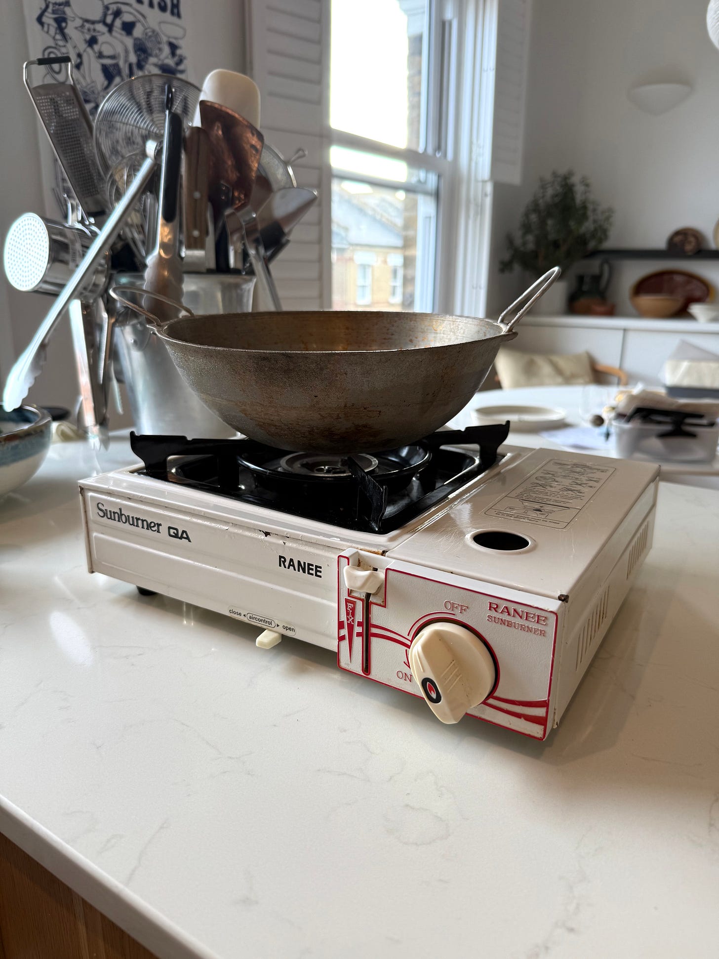 This particular wok is one I bought in India and used constantly for years. Since moving house and losing the luxury of a gas hob, I now cook on a portable gas stove when I want that proper heat, hence the slightly rogue setup here.