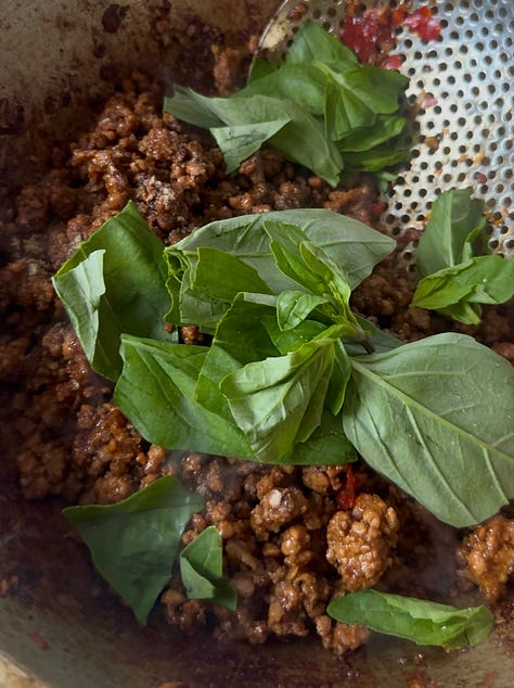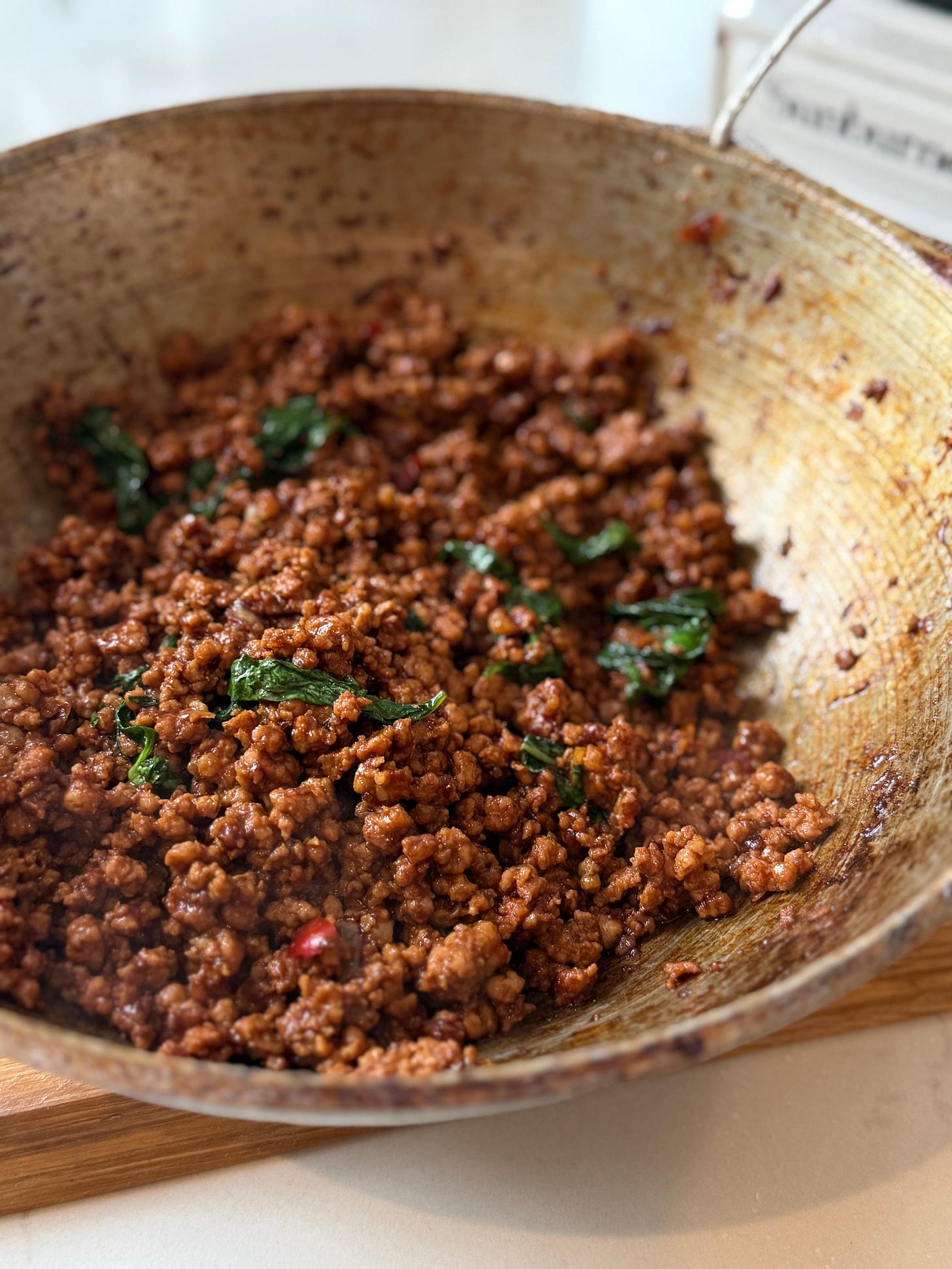 I bought this holy basil in the supermarket, and you’ll find it in bigger bunches in Asian shops, but in all honesty, I used to cook it with just regular basil and it still delivers!