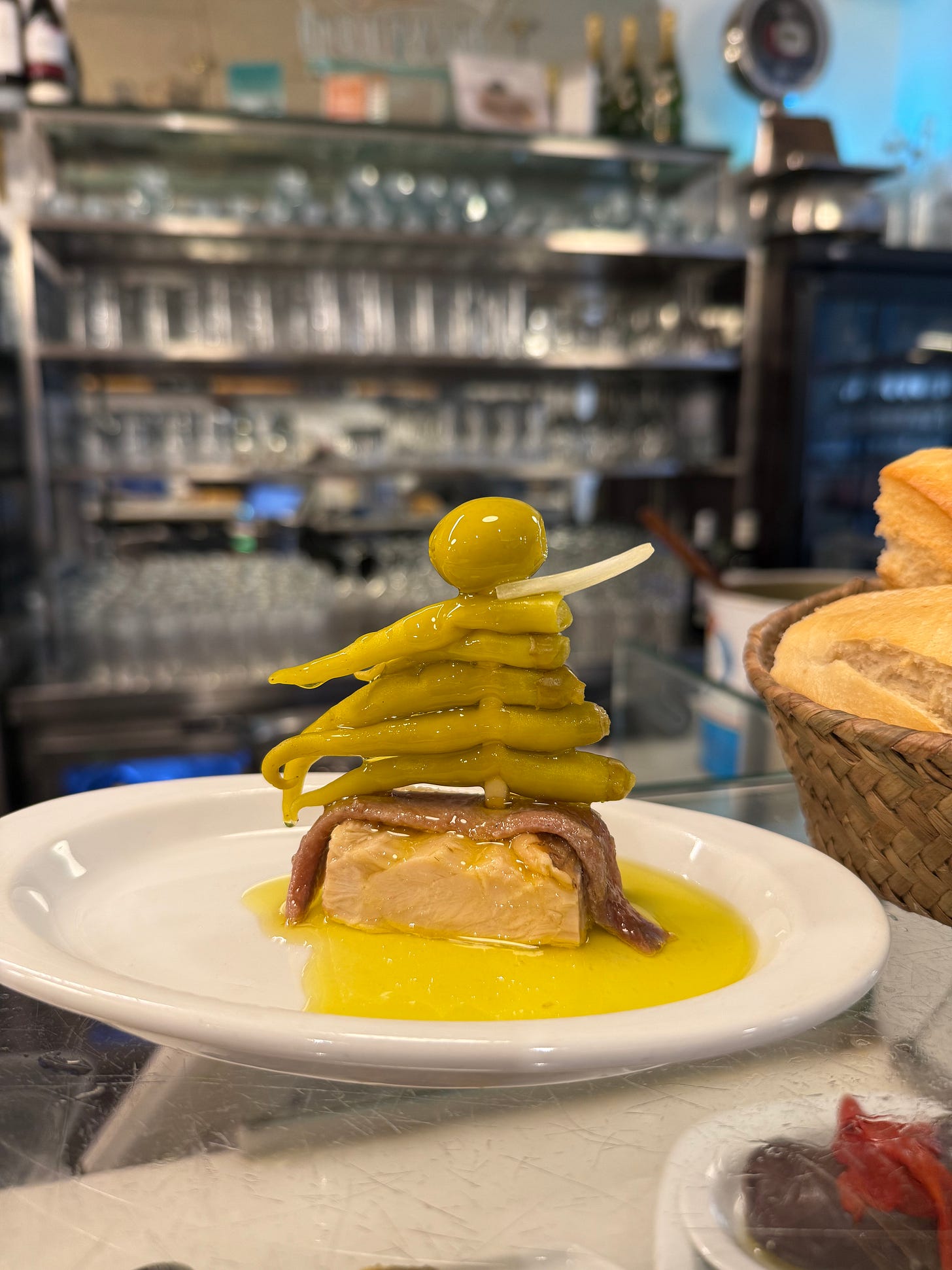 Nicola and I were making pepper salad on the second day for our substack live, which gave us the perfect excuse to actually cook. We took peppers, sweet Spanish onions, local anchovies and bonito back to our apartment and it made for a memorable meal.